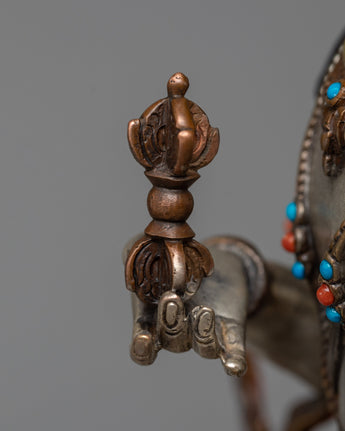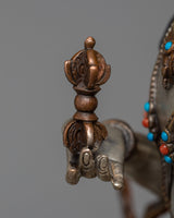 Presenting the handmade statue of the bodhisattva of purity from Tibetan Buddhism, the Vajrasattva. This monument, which was painstakingly made by hand with great care and skill, is a witness to the profound spiritual practice of cleansing. The combination of acrylic and gold paints on an oxidized copper body plated in silver produces an enthralling look that emphasizes the calm and dignified manner of Vajrasattva.