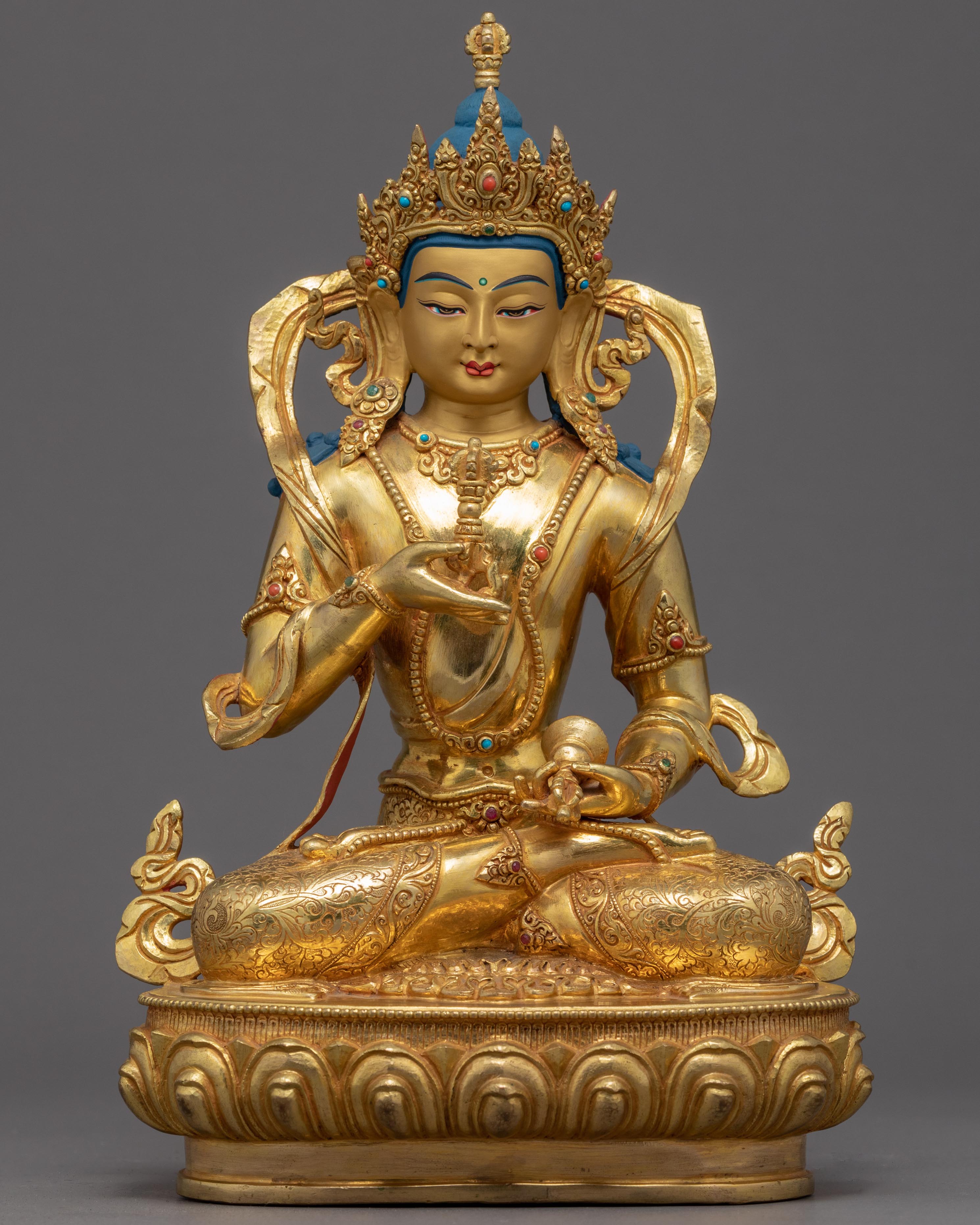 Traditionally crafted, the statue depicts the deity Vajrasattve during his meditation atop a moon disc lotus. This flawless piece of art is carved from a copper body glided with 24k genuine gold and finely painted in acrylic colors. The statue is depicted holding a vajra with his right hand and a bell with the other hand. The precise gold coating is executed perfectly, highlighting the intricate design in detail and giving the statue a vibrant shine. The crown that is worn by the deity is lavishly decorated with precious gemstone and turquoise. This magnificent statue can be a perfect gift for your meditational practice.