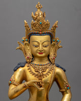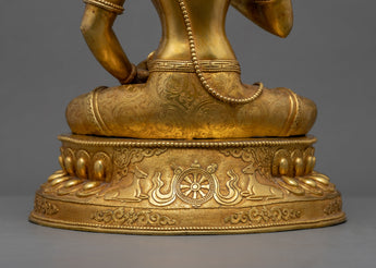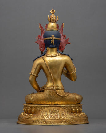In our studio, the Vajrasattva Mudra Sculpture was skillfully hand-made utilizing the ancient Himalayan art technique. The deity is depicted sitting on a lotus on top of a moon disc while holding a vajra in his right hand and a bell in his left. He had a contented look on his face. We are the current progenitors of a century-old Buddhist Himalayan art form that involves the creation of holy sculptures. We worked diligently for months to create this statue. Copper shapes the body, and 24K pure gold is used for gilding it. The statue is coated with acrylic paint and covered in valuable coral and stones for further embellishment.
