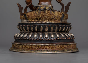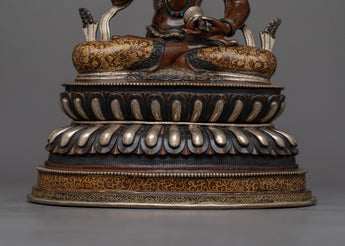 Experience the Vajrasattva Oxidized Statue, a representation of spiritual clarity and purification, and its transformative presence. This stunning statue, standing at 15.35 inches, symbolizes the Vajrasattva's function in Buddhist tradition as the embodiment of purity and the ability to remove karmic impediments. This statue depicts the minute details of Vajrasattva's graceful posture and peaceful look. It is made of oxidized copper and is further accentuated with silver plating.