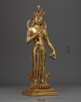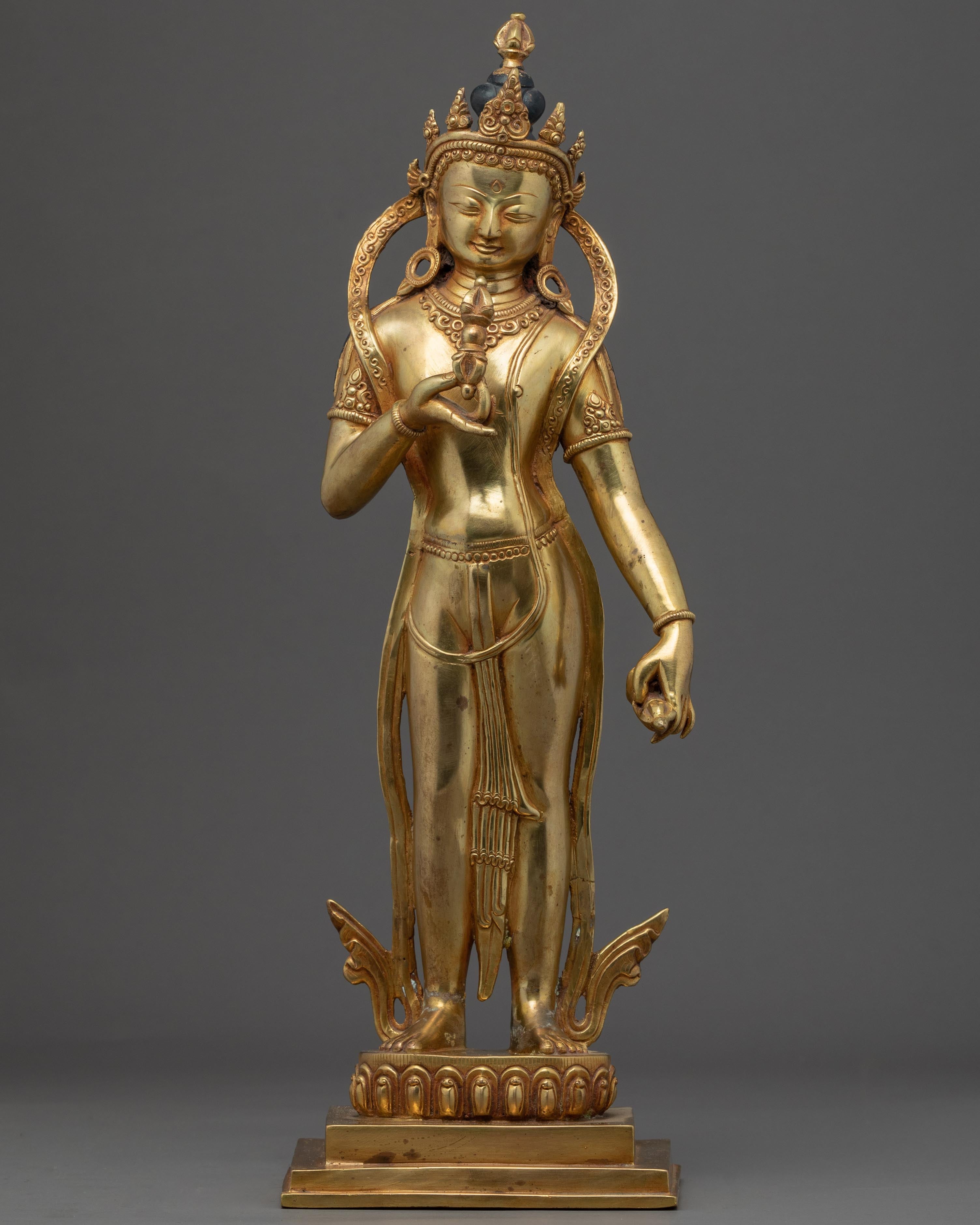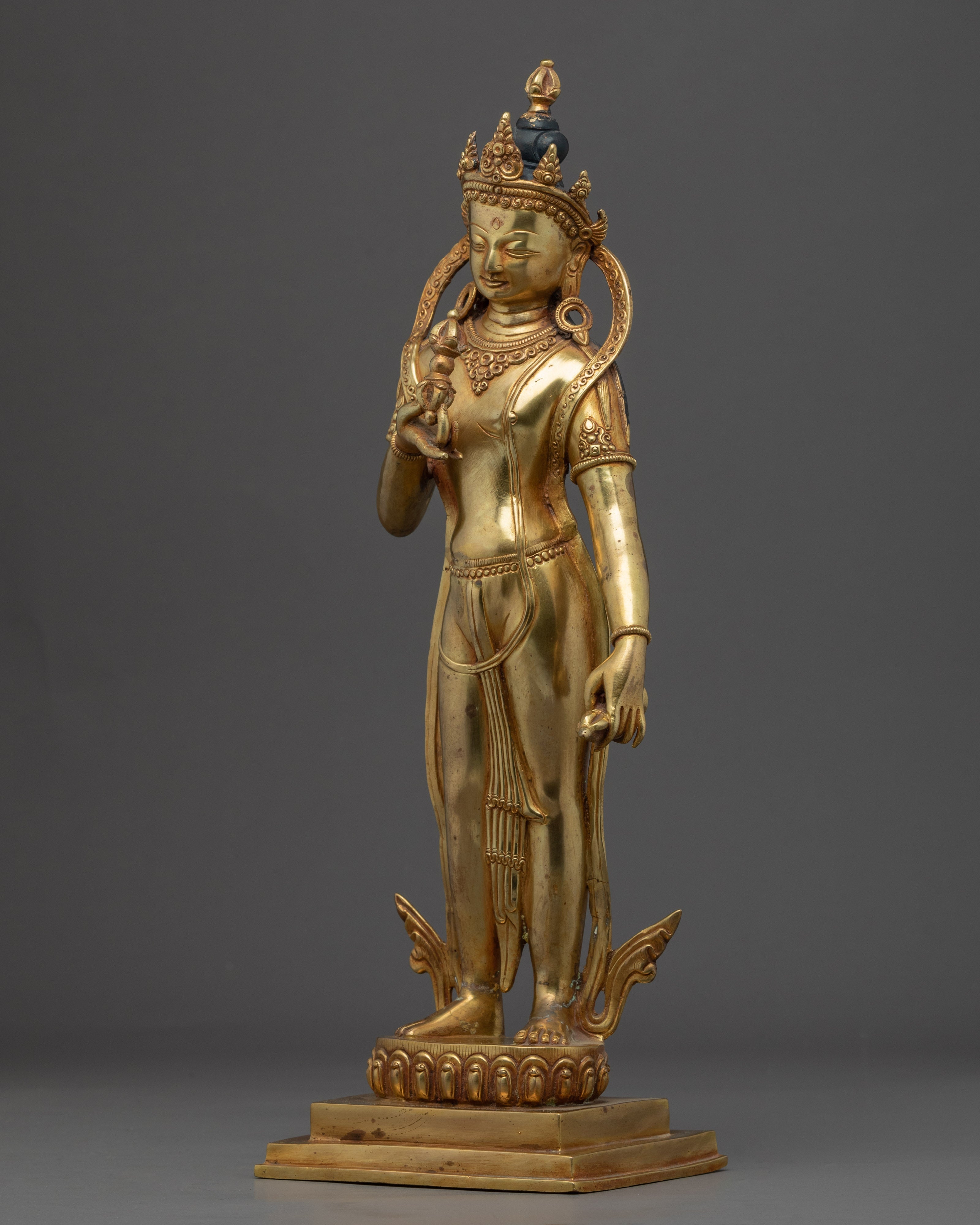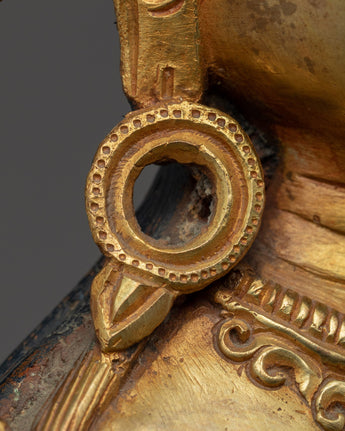 With the skillset and technique inherited from centuries, we have beautifully crafted the Vajrasattva Practice Statue in our studio. We have designed the statue in an accurate traditional iconography. We have portrayed the deity upholding a vajra with his right hand close to his chest and a bell on the other. We molded the body using the copper body and later gilded it using 24 Karat gold. The gilding of the gold gives the gold a stunning shine. We have hand-craved design patterns on the crown and the scarf. You can use this figurine for different Buddhist Rituals and daily practices.