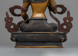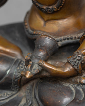 The oxidized copper body of this statue accentuates its textured appearance and lends it an aged, revered appearance that is in line with the ageless wisdom of the Vajrasattva. The oxidation process draws attention to the fine details of his elaborate decorations and thoughtful expression, as well as giving the sculpture more depth.