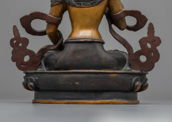 The hand sculpted Vajrasattva Primordial Buddha statue, fashioned in the rich artisan traditions of Nepal, embraces the essence of purity and spiritual regeneration. Vajrasattva is portrayed in a meditative stance holding a vajra, signifying his dedication to spiritual development and clarity. He is highly regarded in Vajrayana Buddhism for his role in purification and as the embodiment of the Buddha's pristine nature.