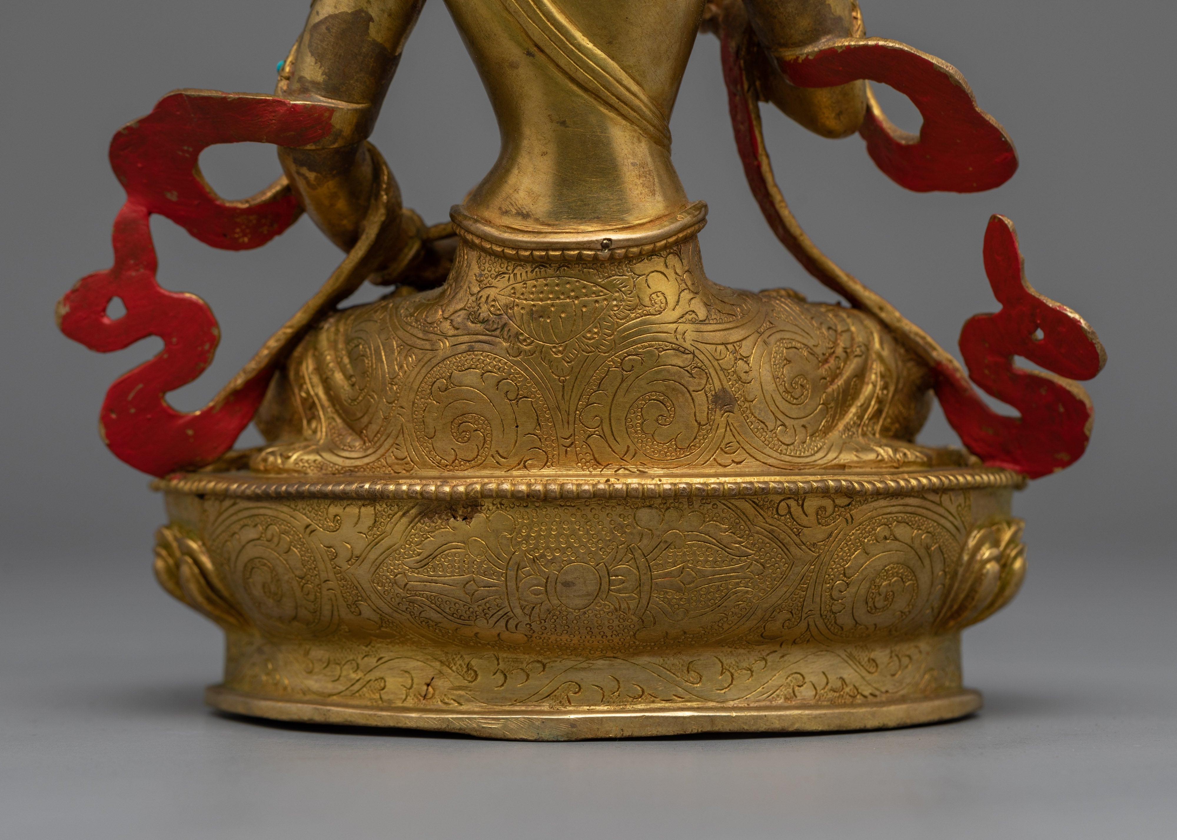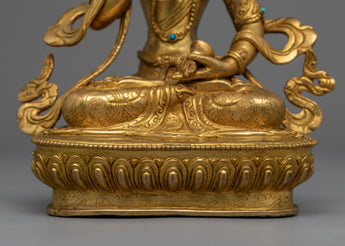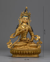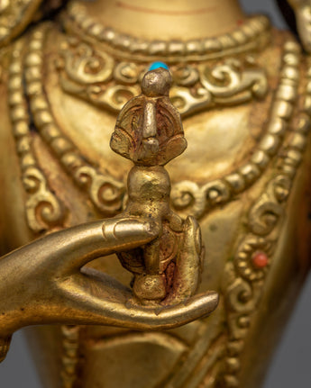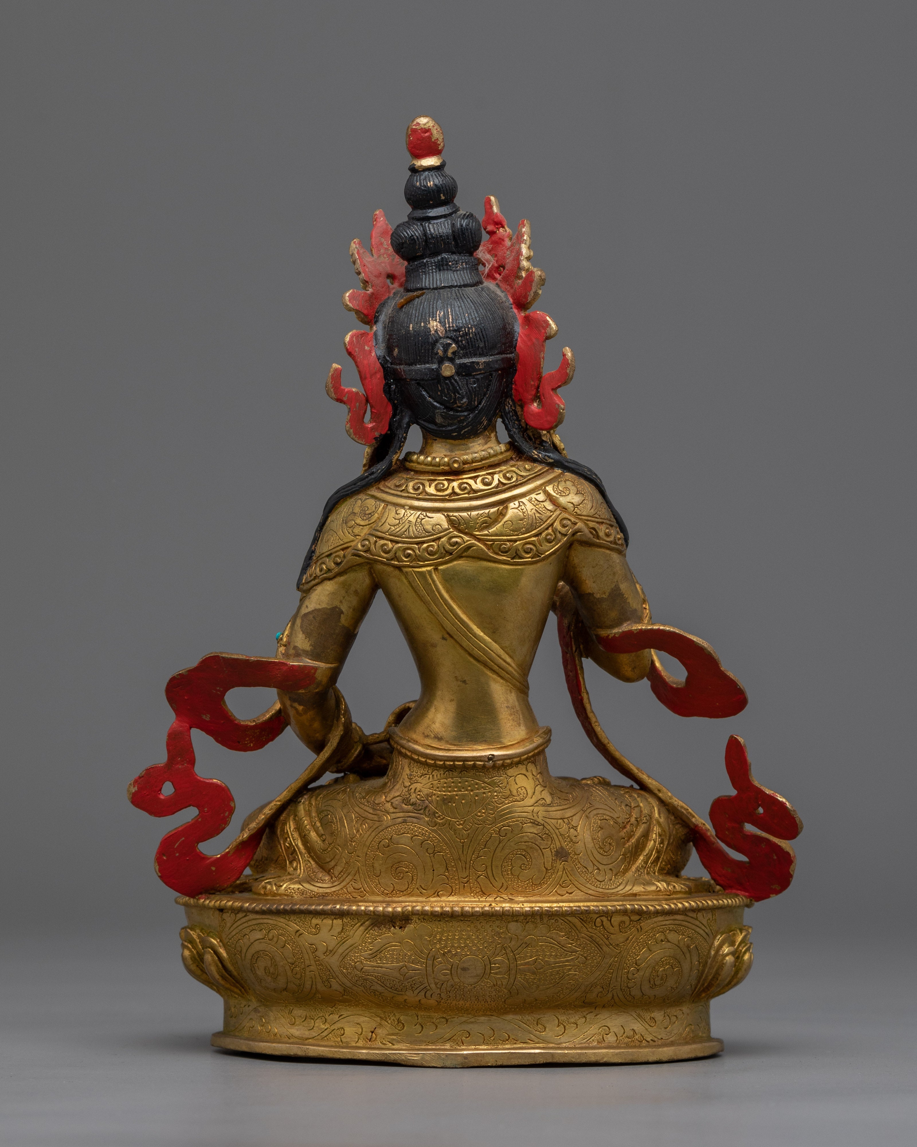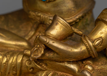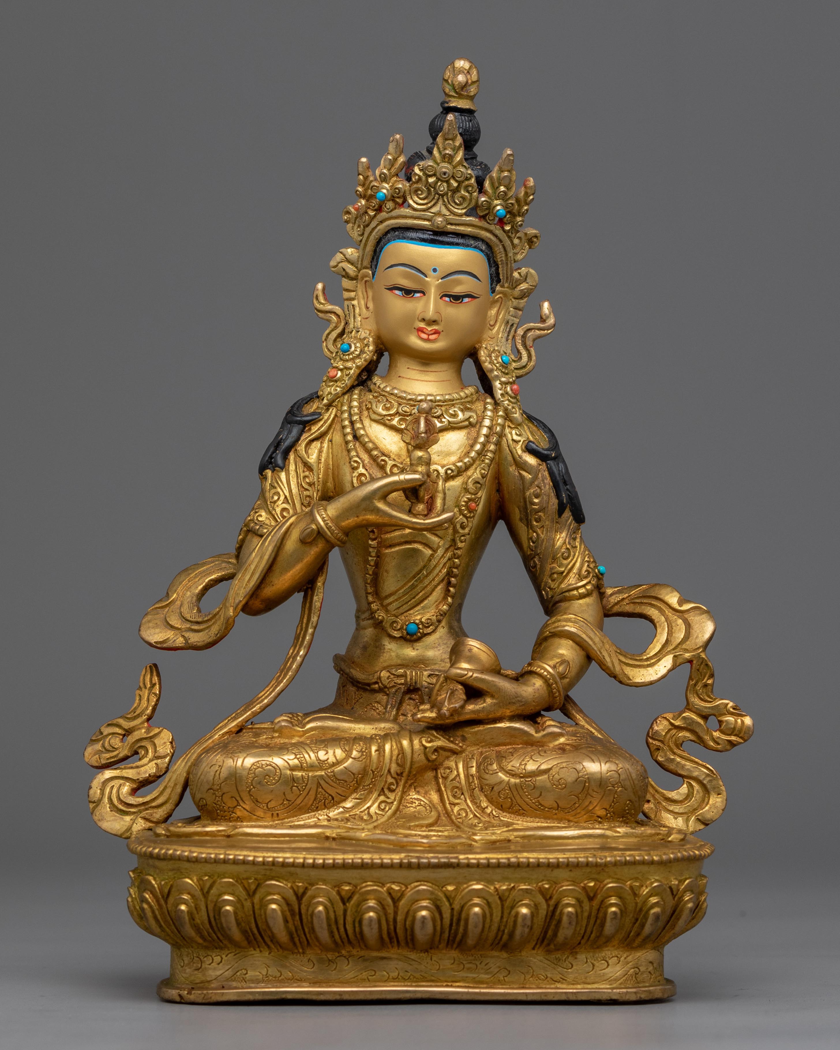 This statue of Vajrasattva Sculpture showcases exquisite craftsmanship using traditional Himalayan techniques. The body of the statue is made of copper and adorned with intricate designs that have been gilded with 24-karat gold, adding to its brilliant luster. The Buddha is seated atop a moon disc lotus seat holding a vajra in his right hand, symbolizing the indestructible and unchanging nature of reality, and in his right hand, he holds a bell symbolizing emptiness and the sound of wisdom. It is a beautiful piece made by our artists after months of hard work, and the addition of jewels to the statue only beautifies the statue more.