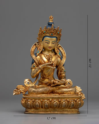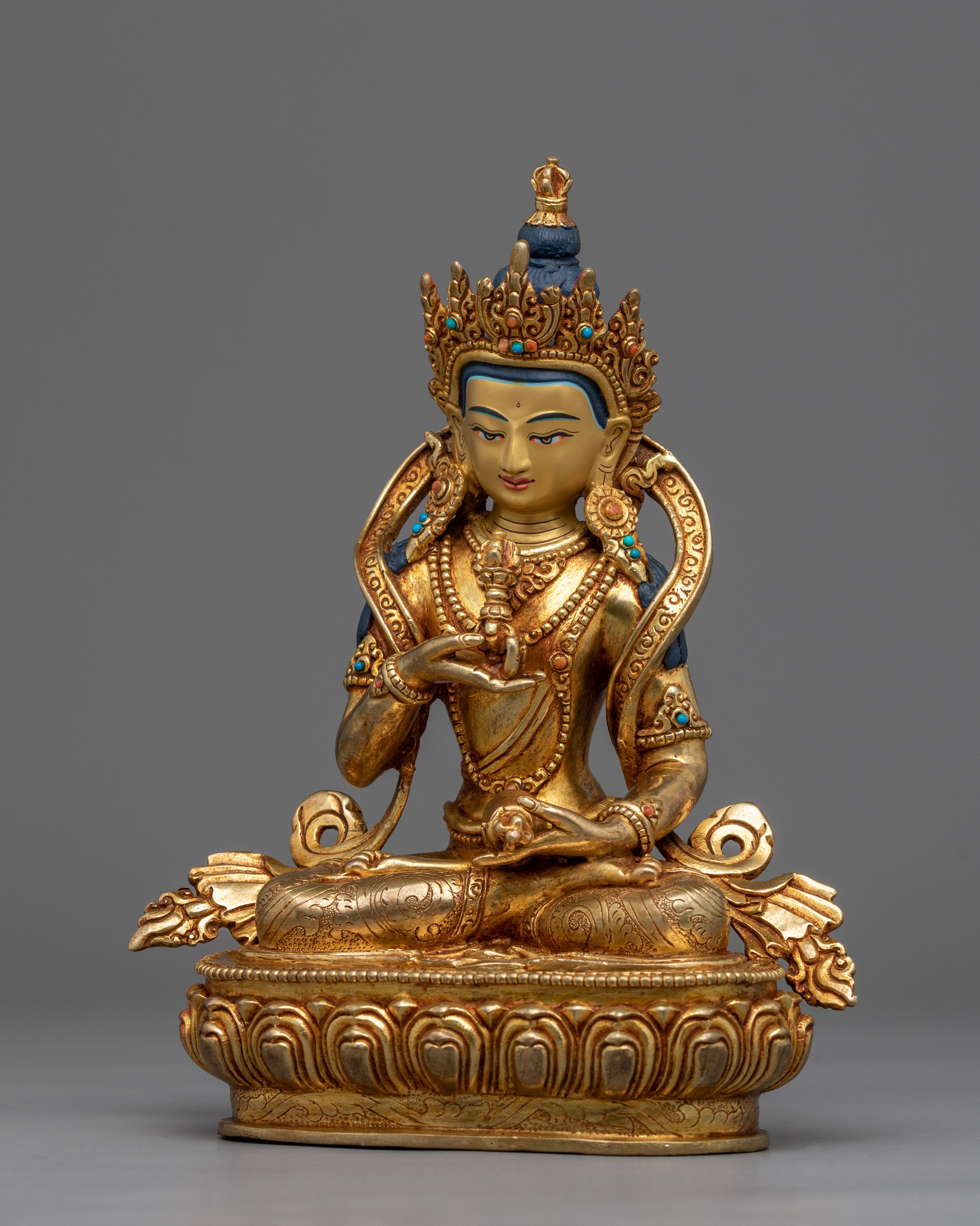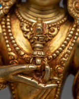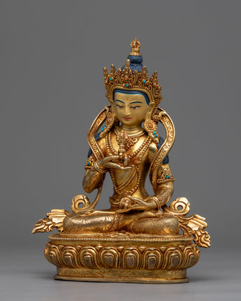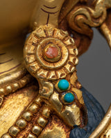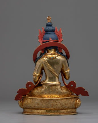 This Vajrasattva statue is a masterpiece of traditional Himalayan artistry, meticulously hand-carved in our studio. The statue depicts the Bodhisattva in a serene and peaceful state, seated on a lotus seat in the lotus posture. The statue is made of copper and then gilded with genuine 24K gold, giving it a brilliant luster and highlighting the intricate design patterns. The Buddha's right-hand holds a vajra, symbolizing the indestructible and unchanging nature of reality, while his left-hand holds a bell, representing emptiness and the sound of wisdom. Our skilled artists took several months to carve the statue's intricate patterns and motifs, which are beautifully highlighted with acrylic colors.