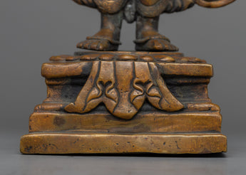 Our standing Vajrasattva Standing Artwork, a work of exceptional craftsmanship that stands 17.3" tall with a 6.6" base, will elevate your spiritual haven. The intricately detailed bright acrylic paintings on this statue, which was expertly carved from an oxidized copper body and polished with an ancient patina, showcase the great craftsmanship of Nepal.