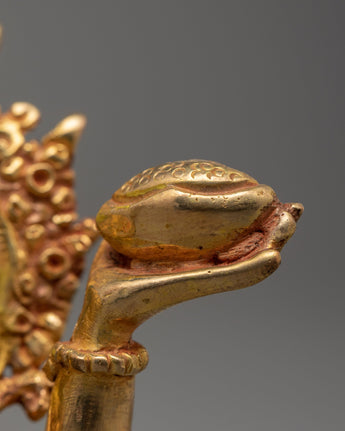 The Vajrasattva with Consort Buddhist Altar Statue is a handcrafted piece created by artisans in Patan, Nepal, which is known for its rich tradition in Buddhist sculpture. This statue, which serves as a powerful symbol of purification and spiritual development, is a centerpiece for any meditation or altar setting. It stands 9.6"/24.5cm tall, has a base of 6.3"/16cm, and weighs 2.00 kg. It is made of copper, 24K gold gilding, and gold and acrylic paintings.