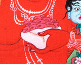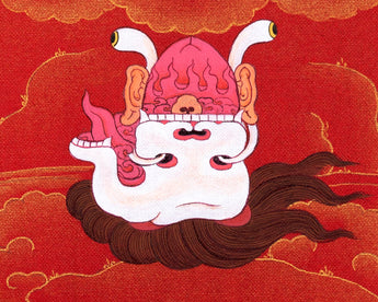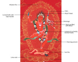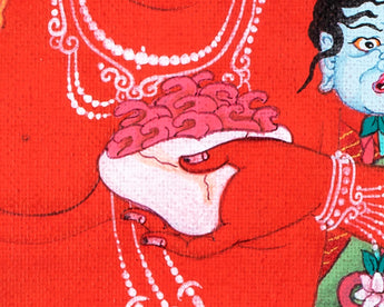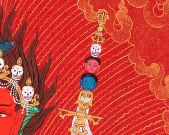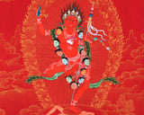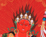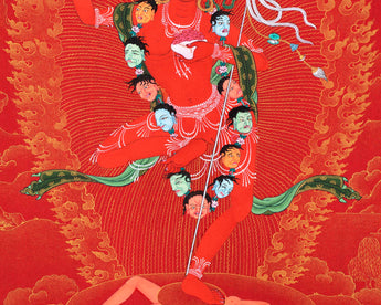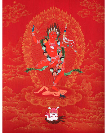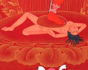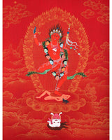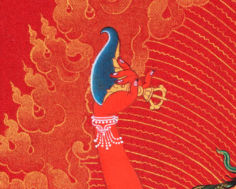 Our artist used Acrylic colors and 24K gold to paint a Vajravarahi thangka, commonly known as Dorje Phagmo. This Thangka wonderfully depicts Vajravarahi's vision and symbology, which reifies the transformative yogic meditations attributed to the purification of the subtle body. There is a human corpse on top of the sun disk. Vajravarahi is formed by radiant light rays that originate the bija VAM in the disk's core. Vajravarahi manifests as a luminous red-figure dancing in Ardhaparyanka asana with her left leg atop the torso, coming from within a delightful circle of blazing flames.