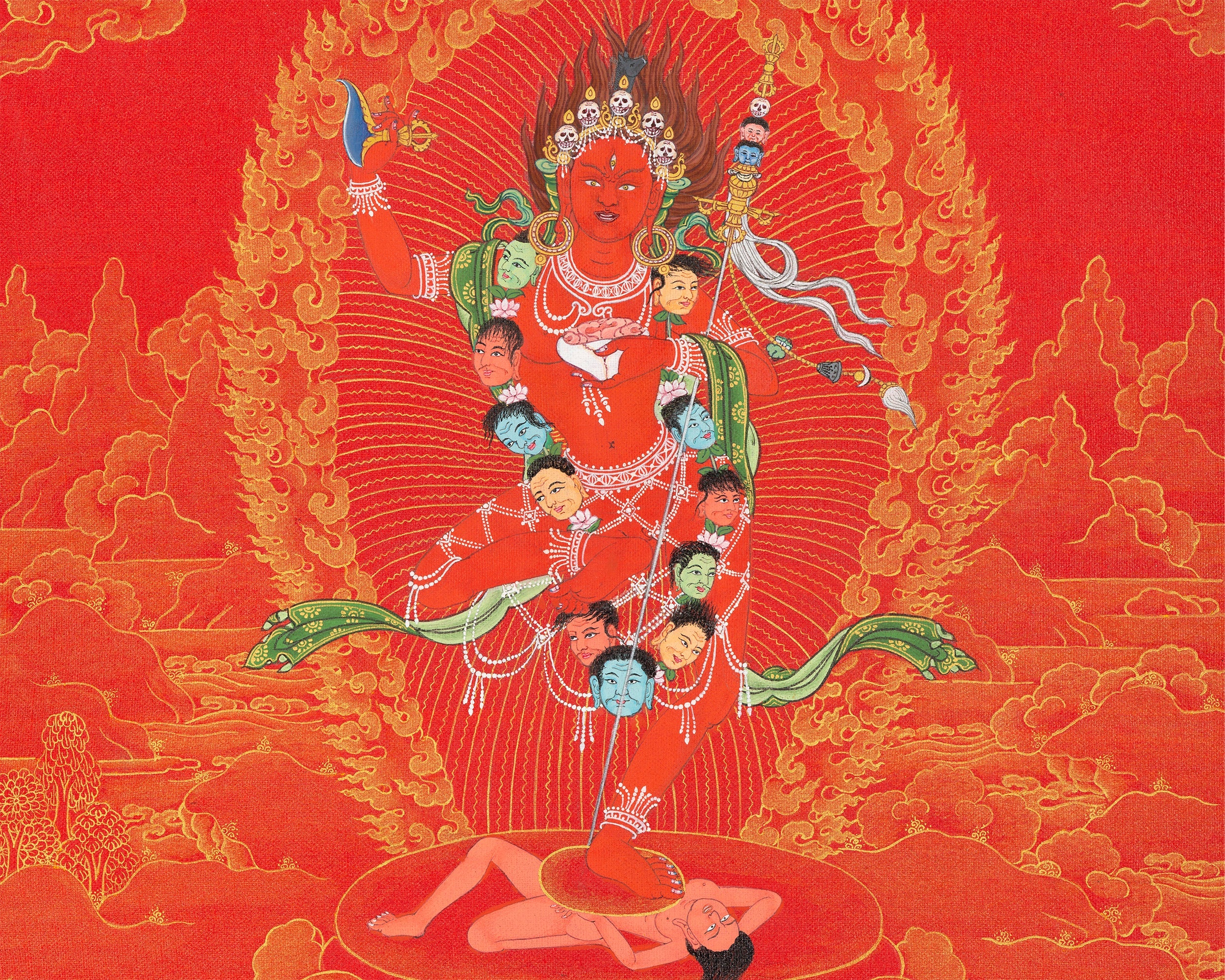 Vajravarahi embodies the ultimate experiences and realizations of supreme bliss and emptiness—the essence of the completion-stage practices—as the purifying inner heat of the navel chakra. She carries a blood-filled skullcup with swirling waves of ambrosia in her left hand and a vajra-tipped flaying knife in her right. A prominent khatvanga symbolizes her non-dual union with Chakrasamvara. The ceremonial staff also indicates that she is accompanied by the entire entourage of the Sixty-two-Deity Chakrasamvara/ Vajravarahi Mandala. She is naked, dressed with the five bone decorations (Pancha mudra) and the delicately drawn lacelike bone apron, which collectively signify the five perfections, with a brown sow's head appearing behind her right ear. She is pictured gently smiling, her hair loosened, laughing with bared teeth, infused with both passion and rage. She is wearing a lengthy garland of fifty freshly severed heads, tied together with intestines, instead of her usual necklace of dried skulls.