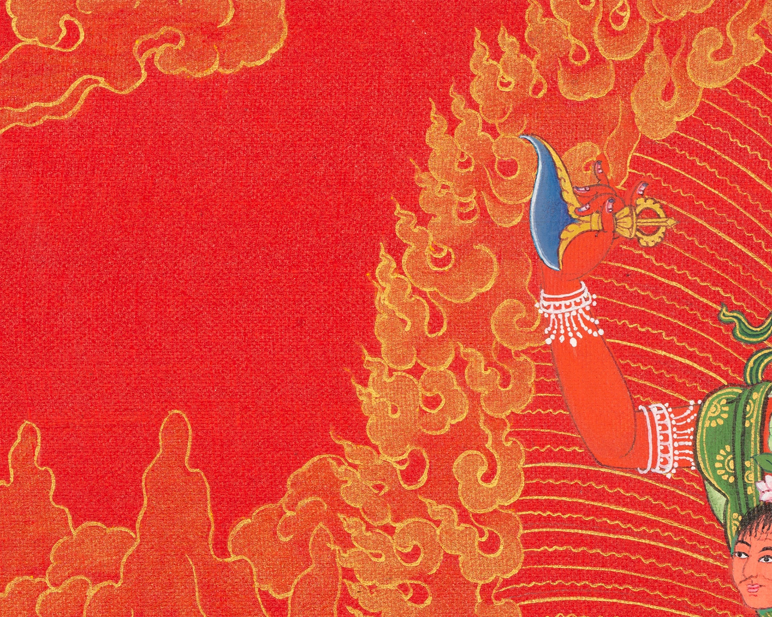 Our artist has painted a Vajravarahi thangka in the Marthang style. Vajravarahi's vision and symbology, which reifies the transforming yogic meditations related to the purification of the subtle body, are beautifully painted in this Thangka. On top of the sun disk, there is a human corpse. Radiant light rays form the bija VAM in the disk's core and become Vajravarahi. Vajravarahi appears in a dazzling red-figure emerging from within a beautiful circle of burning flames, dancing in Ardhaparyanka asana with her left leg atop the body.