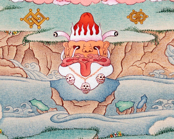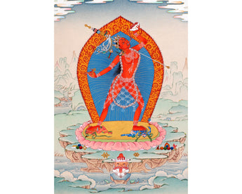 Vajrayogini is a Dakini who is the most prominent tantric deity in Vajrayana practice. This Yogini thangka is painted in genuine 24K Gold and natural stone colors. She is also known as 'The Powerful divine Red Lady,' who is standing in a sun disc seat. She wears a skull necklace, holds a skull cup in one hand, and flags the knife with the other. In Vajrayana, the vajrayogini practice and mantra are immensely profound and meaningful.