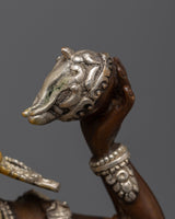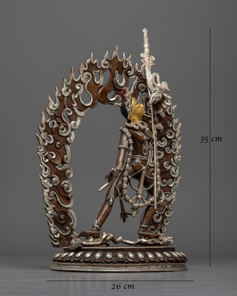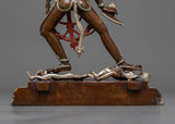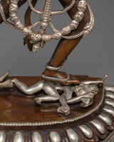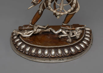 This elegant statue has a remarkable and heavenly aspect due to its skillful construction from an oxidized copper body and silver coating. The contrasting parts of the silver and oxidized copper plating accentuate the fine details of Vajrayogini's outfit and her elaborate expression. It is a powerful object that weighs 3.396 kg, which makes it perfect for any area used for spiritual development, meditation, or analysis vajrayogini Practice.