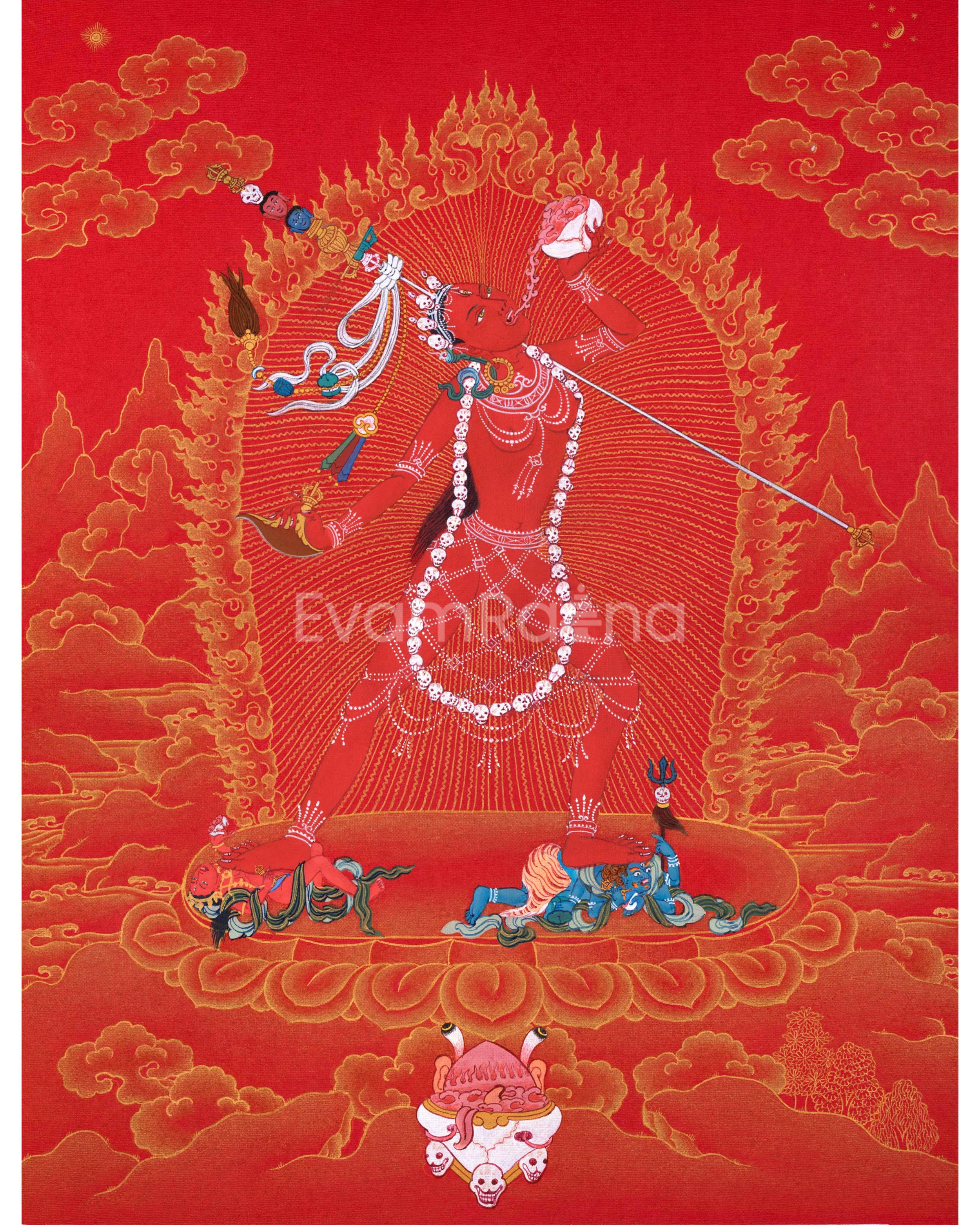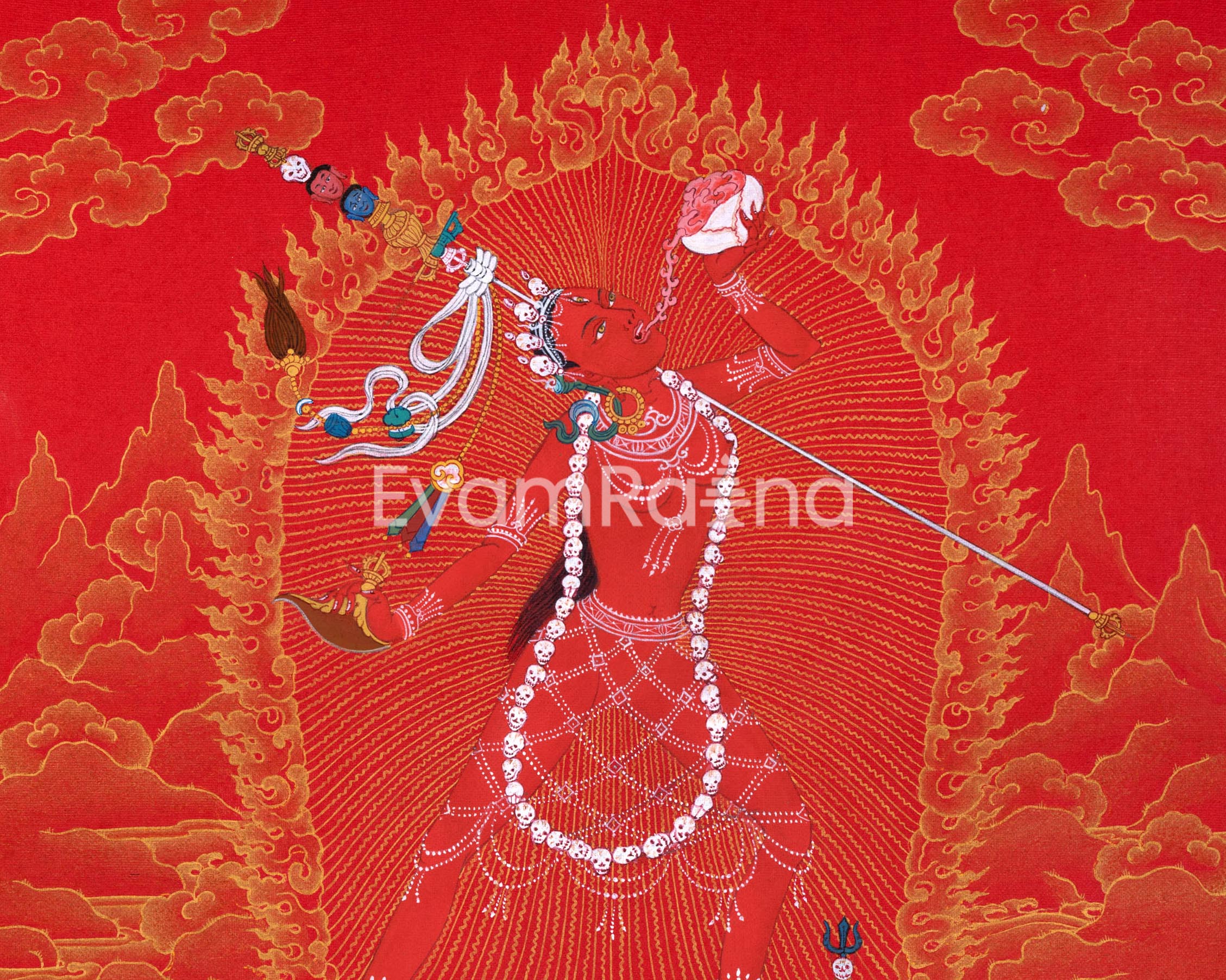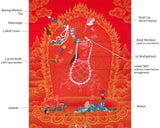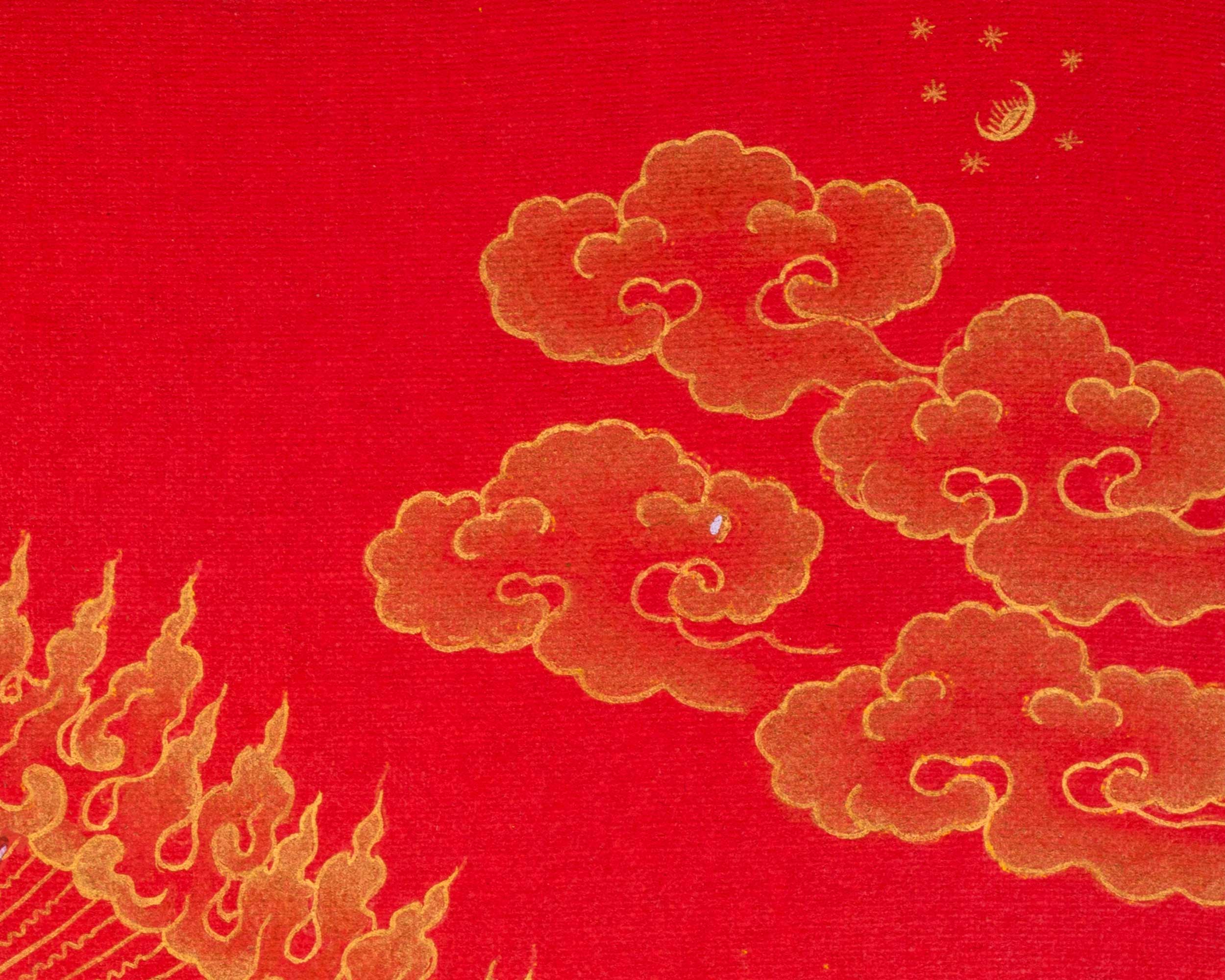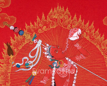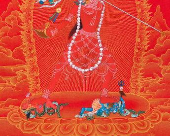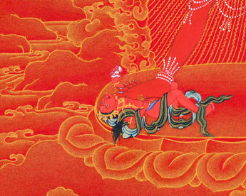 This Vajrayogini red and gold thangka is the perfect addition to any vajrayana practitioner's collection. Its intricate design and vibrant colors depict the powerful female deity, believed to possess the ultimate wisdom and compassion. Enhance your practice with this beautiful and sacred thangka.