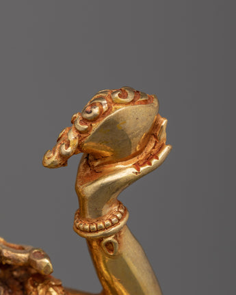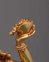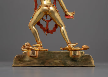 The Vajrayogini Tibetan Tantric Deity in Dance Posture is a depiction of feminine strength, wisdom, and enlightenment. This statue, handcrafted in Patan, Nepal, is hand-crafted copper body gilded with 24K gold, and embellished with elaborate gold and acrylic paintings. It is a fine example of the region's renowned artistic skill, measuring 10.2"/26cm in height and 7.1"/18cm at the base and weighing 1.51 kg.