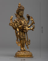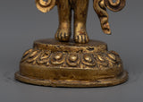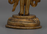 Majestic standing Vasudhara Goddess Statue, intricately handcrafted from a copper body, graced with radiant 24k gold plating, towering at 13.5cm in height with a sturdy 9cm base.