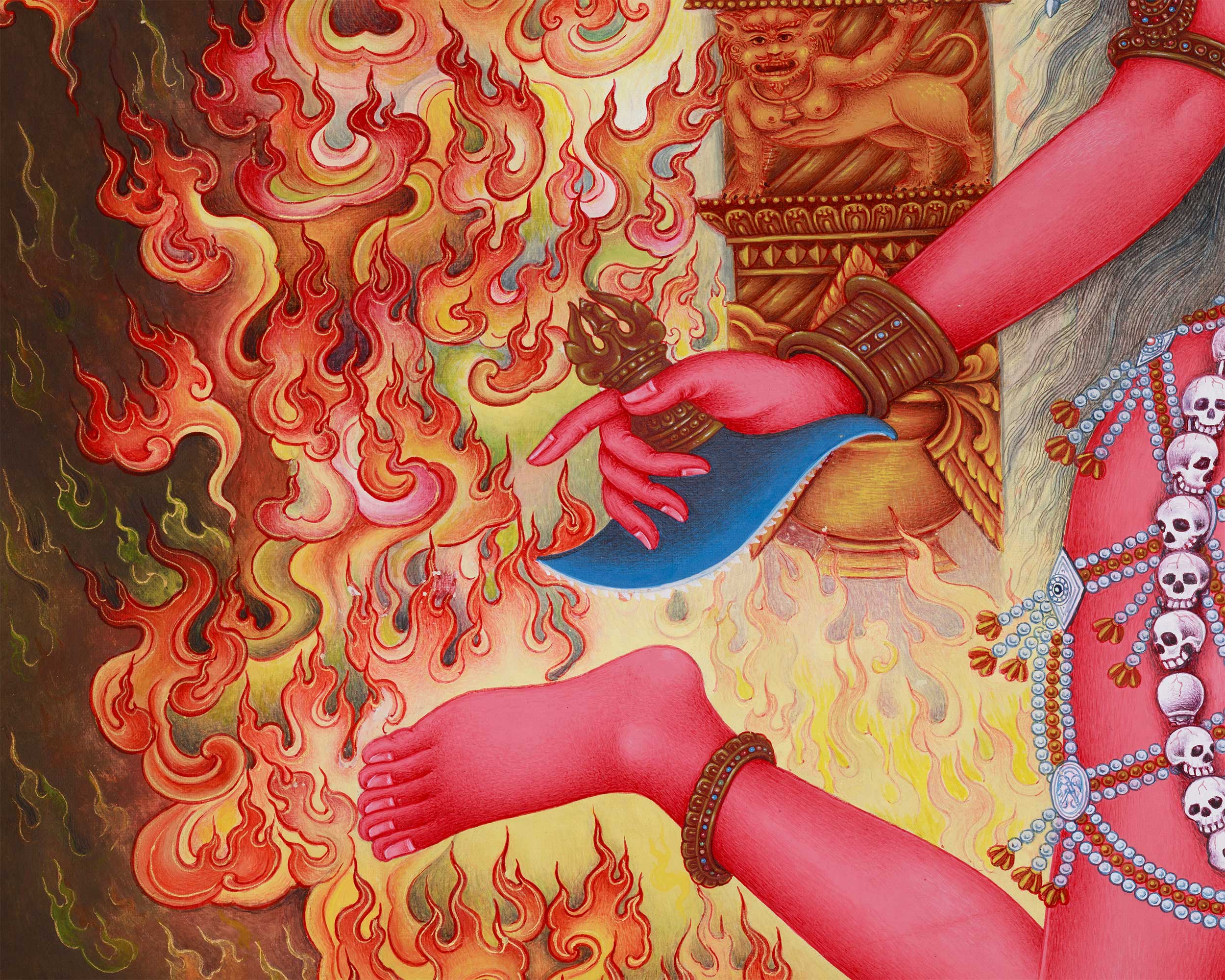 This paubha-style artwork, in the traditional Newar style of Nepal, shows Vidyadhari Yogini soaring through the air. Her dynamic pose radiates transcendence and energy. Her fiery hair rises like a flame, and she is adorned with bone ornaments and a skull crown, symbolizing victory over ego and the cycle of death and rebirth. She grips a knife and a skull cup—tools of transformation—while flying above a figure representing ignorance. The scene echoes Newari temple architecture, with detailed torana-like frames, carved lotus platforms, and vibrant aureoles like Kathmandu Valley shrine frescoes. The swirling flames highlight her fierce compassion and role as a spiritual protector. Elements from her tools to her upward gaze convey the symbolic language of Himalayan Buddhism.