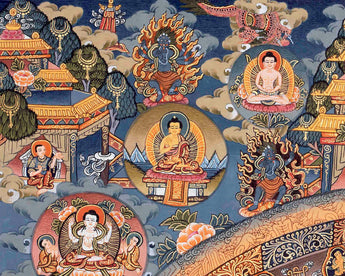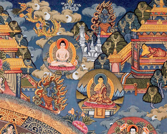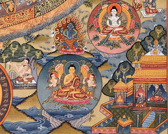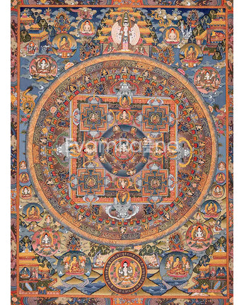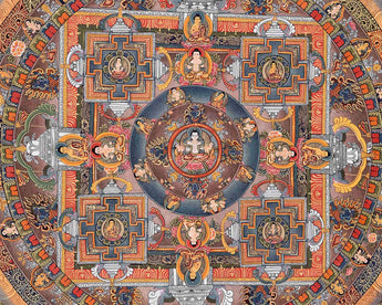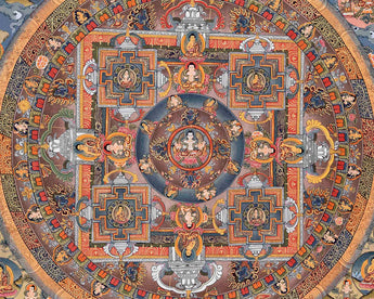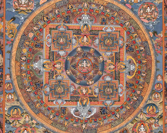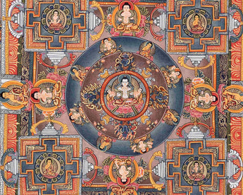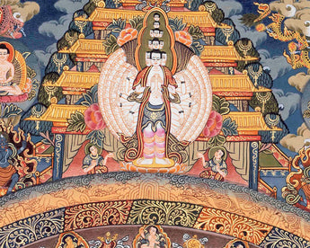 The Vintage Buddha Mandala Thangka exudes timeless elegance and spiritual depth, showcasing the impeccable craftsmanship and profound symbolism of Tibetan Buddhist art. At the heart of the mandala sits the serene figure of Buddha, emanating tranquility and enlightenment to all who behold it. Above, the majestic 1000-armed Avalokiteshvara presides, embodying boundless compassion and mercy, showering blessings upon the world.