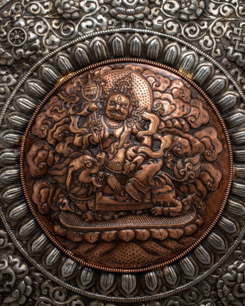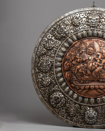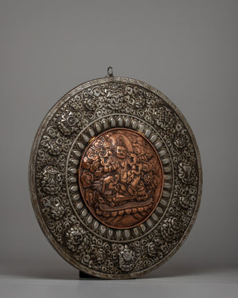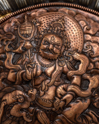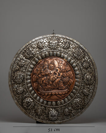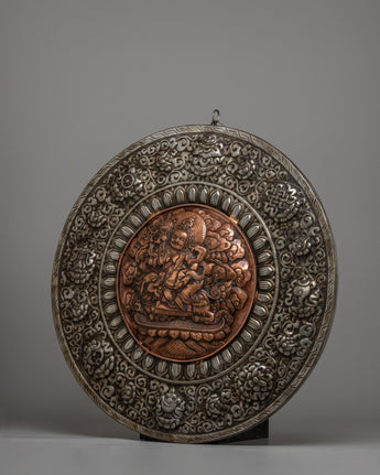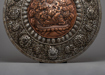 A masterful combination of copper and iron craftsmanship, the Namtoshe Wall Hanging Decor is skillfully crafted to gracefully and elegantly embellish any sacred location. At its center, the inner circle features elaborate copper artwork representing the mystical Namtoshe sign, which denotes good fortune and spiritual protection. The outside portion of the decor, which is made of iron, encircles this center pattern and provides a strong, aesthetically pleasing framework.