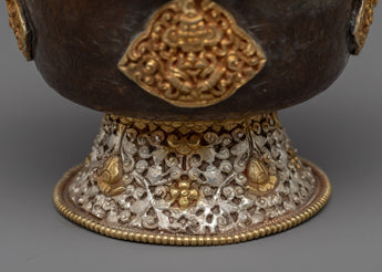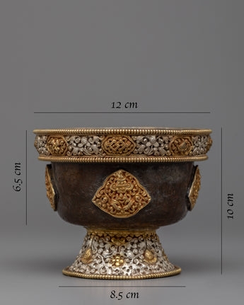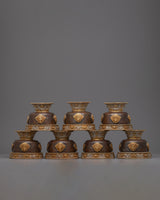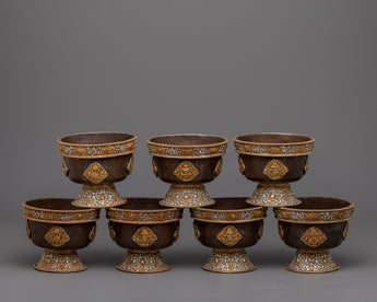 These Water Offering Bowls are a lovely symbol of Tibetan Buddhist devotion and ceremony. They are handcrafted with precision and care from copper and plated with gold and silver, providing a beautiful contrast. The bowls are embellished with auspicious symbols that have been carefully sculpted to increase purity and visual appeal. These bowls are used to offer water as a basic aspect of Buddhist practice, symbolizing cleanliness, cleaning, and the aim to cultivate virtuous traits. These Water Offering Bowls, with their exquisite craftsmanship and spiritual symbolism, are a meaningful addition to any altar or spiritual area, bringing a sense of tranquility, reverence, and connection to the spiritual path.