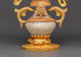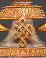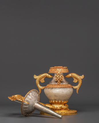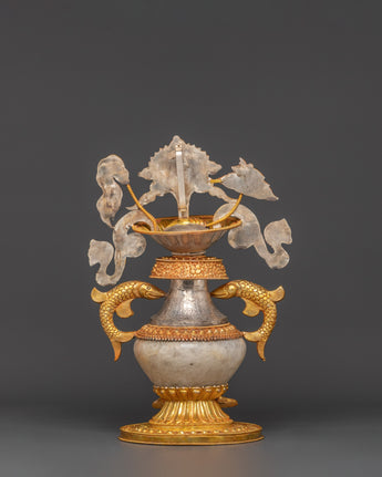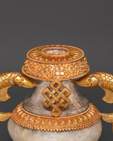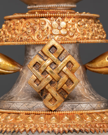 The intricate craftsmanship of these water offering pots showcases traditional Tibetan themes, including the unending knot and lotus blooms. The contrast of gold and silver plating on a solid copper base creates rich visual depth and immortal beauty. The crystal accents intensify their heavenly energy, making them an effective tool for meditation and ceremonial rituals. Each piece holds the ancient Ashtamangala's blessings, which comprise eight auspicious symbols that signify wealth, protection, and spiritual enlightenment.