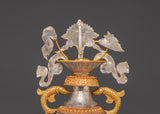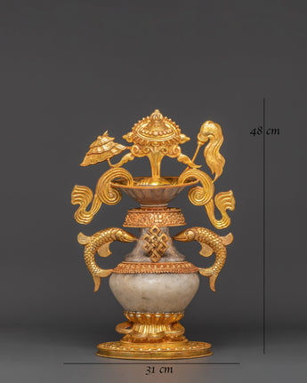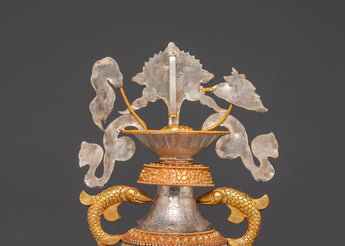 This Water Offerings Ashtamangala Pot Set is a traditional Tibetan spiritual pot intended for sacred Buddhist rites. These magnificent pots represent the donation of pure water, which is a key practice for gaining merit and eliminating negative karma. Each pot is expertly crafted from copper, plated with electro-gold and silver, and adorned with glittering crystals, resulting in a magnificent work of ritual art. This set, which stands 49 cm tall and 31 cm in diameter, creates a genuine sense of spiritual well-being for your altar, meditation room, or holy space.