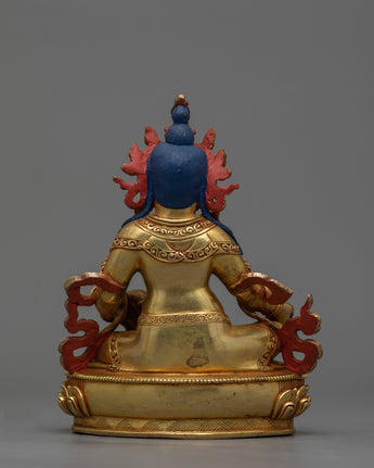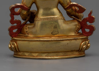 Wealth God Dzambhala Statue is a work of divine artistry that shows the way to financial satisfaction. Experience the blessings of success. This statue, which was carefully constructed with every detail in mind, is 6.7 inches tall and 5.1 inches broad at the base. This statue precisely applies gold and acrylic paints and is crafted from the best materials, such as copper gilded in 24K gold. It perfectly captures the grandeur and splendor of the Wealth God Dzambhala. emitting a wealth and abundance aura and emanating the heavenly energy of success and fortune.