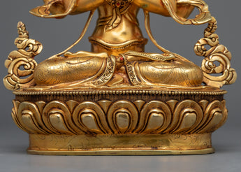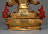 With this stunning copper statue that has been 24K gold-gilded, Avalokistesvara's limitless compassion may be brought into your home or other holy areas. This amazing work, which stands 14.5" tall, tapers to 9.8" at the base, and weighs 3.72 kg, displays the prodigious talent of our Vajrayana craftsmen.