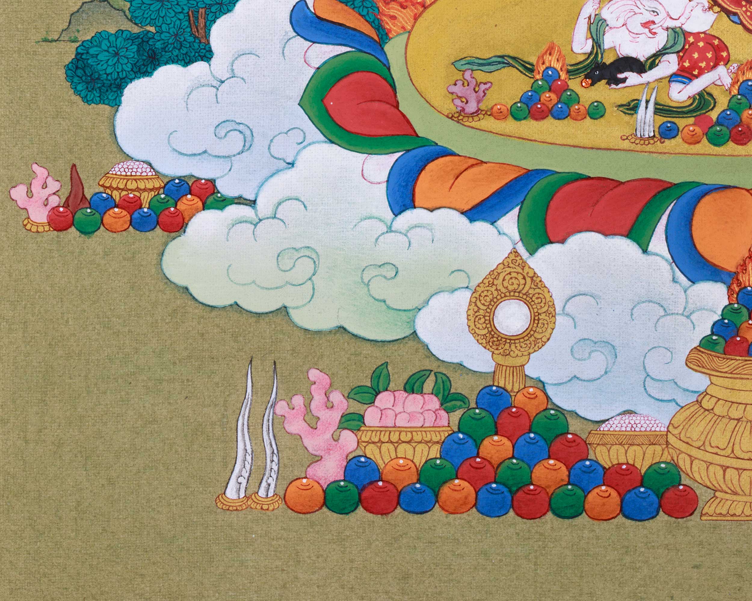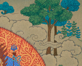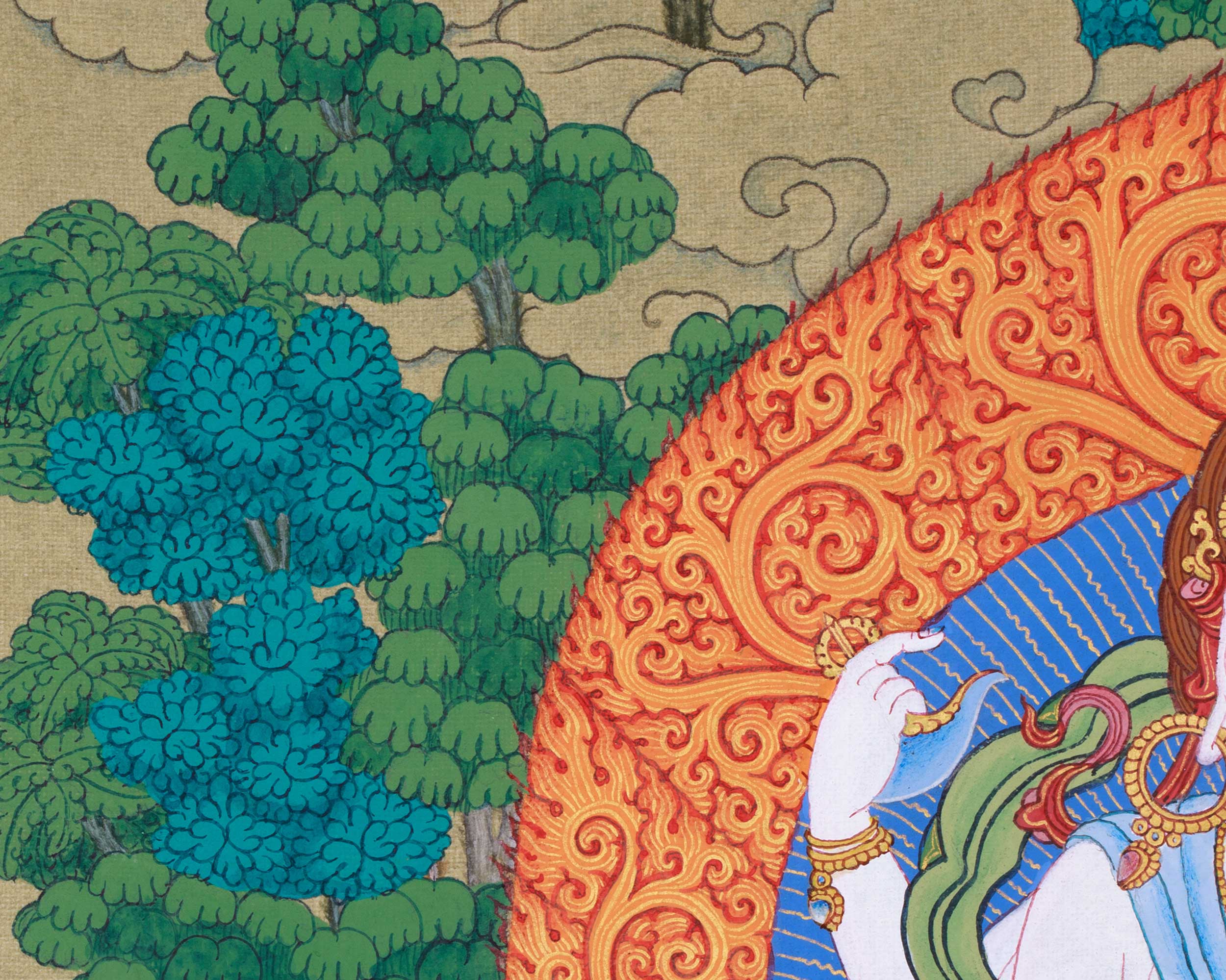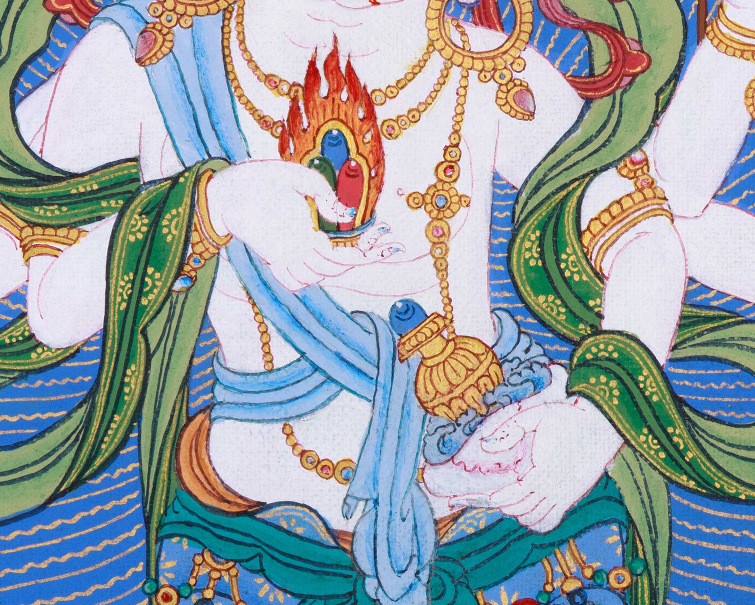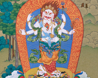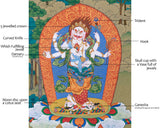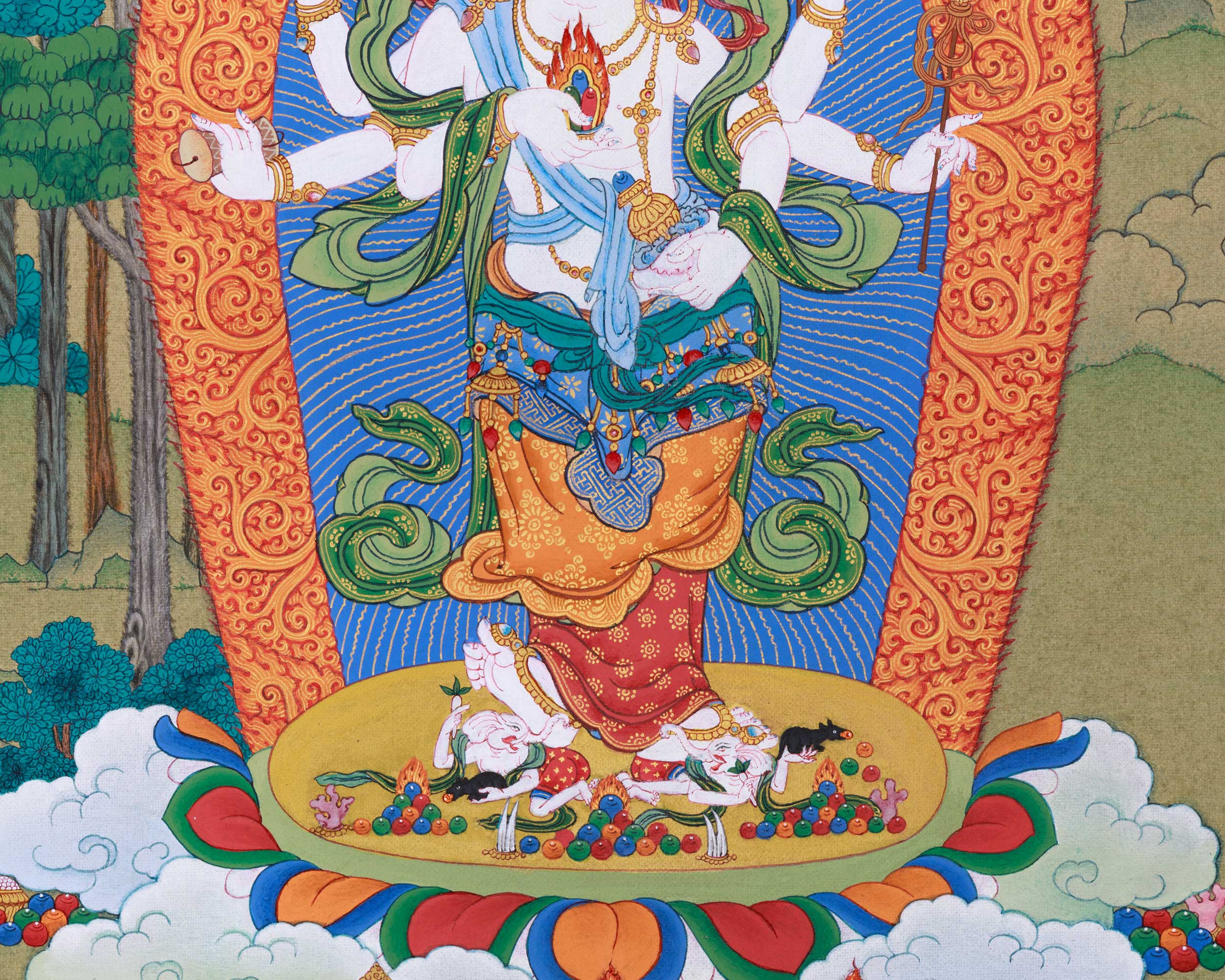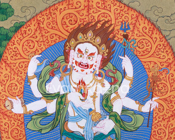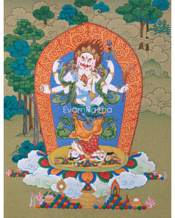 Expertly handpainted with accurate iconography, this white mahakala thangka includes a depiction of sandalwood trees on the background. As a vajrayana practitioner, this thangka is a perfect depiction for your meditation and spiritual practice. He is depicted with his wrathful demeanour, in his six armed form.