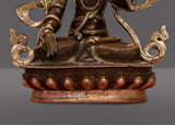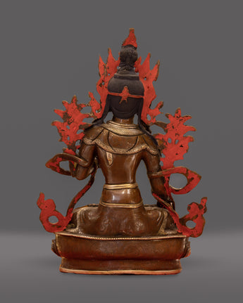 This sculpture is skillfully crafted from an oxidized copper body and enhanced with 24K gold gilding, which creates a stunning contrast with the oxidized copper's deeper tones and highlights her divine presence. Her flowing robes and delicate features are adorned with intricate paintings in gold and acrylic that provide levels of visual richness and spiritual symbolism. Each element, from her peaceful expression to her gracefully poised hands, is designed to inspire calm and reverence.