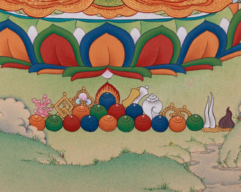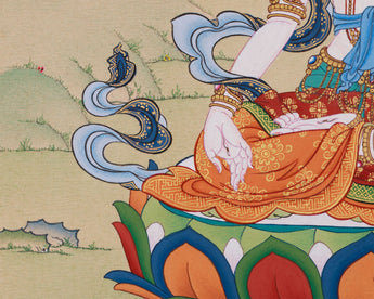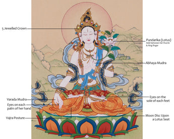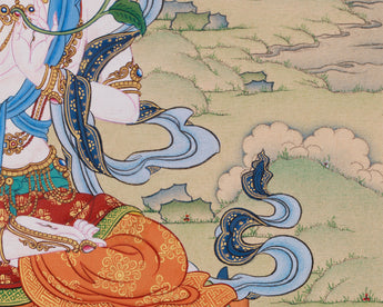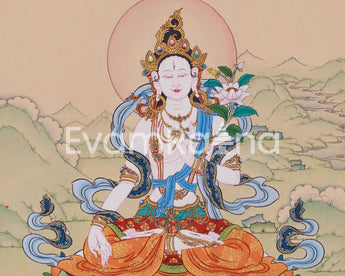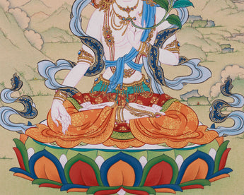 In this thangka, White Tara sits in vajra posture on a radiant moon disc and lotus seat, adorned with a five-jeweled crown, sacred ornaments, and flowing silk robes. Her right hand is extended in the varada mudra, the gesture of generosity, while her left hand is raised in the abhaya mudra, offering protection and fearlessness. She holds the stem of a pundarika (white lotus), symbolizing purity and spiritual awakening. White Tara's seven eyes signify her omniscient awareness and attentiveness to suffering. Every detail, from the bloom of her lotus to the softness in her expression, is a visual reminder of her limitless love and healing energy.