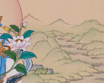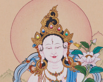 White Tara Buddhist Art represents longevity, healing, and compassionate protection through its hand-painted design. Revered in Tibetan Buddhism as the Goddess of Long Life, it is invoked for physical well-being, spiritual strength, and removing obstacles on the path to enlightenment. This artwork is painted on cotton canvas using natural stone colors and detailed with genuine 24K gold, bringing luminosity and authenticity to her serene form. Created by master artisans in our Enlightenment Studio, every brushstroke reflects devotion, precision, and the spiritual presence that this compassionate deity offers to all beings.