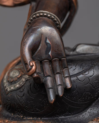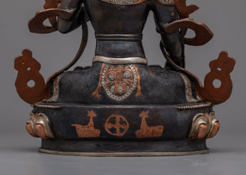 This magnificent White Tara Buddhist Goddess statue is a lovely addition to your own altar or meditation area. The statue weighs 3.48 kg and is 13.7 inches in height with a base diameter of 9.4 inches. Its exquisitely oxidized copper construction and 24K gold and silver plating embellishments capture the divine essence of the White Tara's caring presence.
