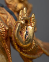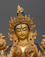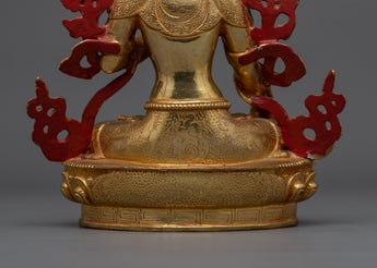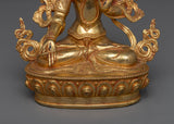 This handmade statue brings the tranquil aura and eternal compassion of White Tara, the Buddhist Goddess of Longevity, to your holy area. This statue, which stands 8.9" (Height) x 7.1" (Base) and weighs 1.44 kg, is crafted of copper, gilded with 24K gold, and embellished with gold and acrylic paints. Crafted by expert Nepalese artisans, this figurine embodies the Himalayan region's rich creative traditions, making it an ideal centerpiece for altars, meditation rooms, or spiritual decor.