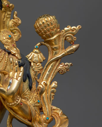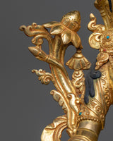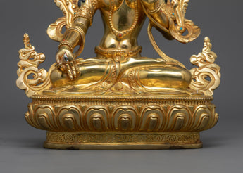 The seven eyes that White Tara has on her face, hands, and soles are what make her so beloved; they represent her omniscient knowledge of suffering in the world and her everlasting dedication to easing it. The 24K gold gilding illuminates the sculpture, reflecting White Tara's role as a beacon of purity and spiritual integrity, guiding practitioners in their journey toward healing and enlightenment. Emotional challenges, embodying a profound source of comfort and healing.