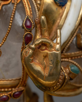 Our White Tara crystal statue, a harmonious blend of divine kindness and unmatched artistry, will enhance your sacred area. The center of this masterpiece is a painstakingly carved crystal that captures White Tara's serene look and ethereal aura. Its resilience is unquestionable, as it is surrounded by copper that embraces the crystal from the rear. The copper is also visible in fine details, such as the regal crown, decorated gems, delicate earrings, and fundamental parts, such as the fingers, legs, and beautiful lotus seat.