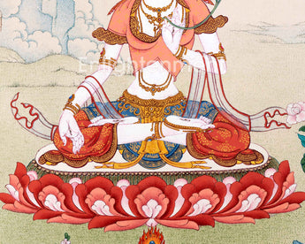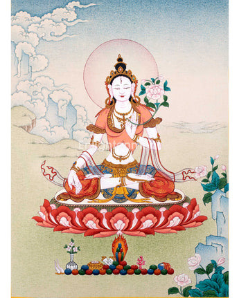 The White Tara Deity Thangka is a truly extraordinary piece of art that pays homage to the beloved Goddess of Compassion and Longevity. This exquisite artwork is meticulously hand-painted on a canvas using a palette of natural stone colors, bringing the goddess to life in stunning detail. White Tara's tranquil and compassionate presence radiates from the canvas, invoking a sense of serenity and healing. To add an ethereal touch, genuine 24K gold accents adorn the Thangka, imbuing it with a divine radiance and elevating it to a sacred level. This remarkable piece is not just a work of art; it's an embodiment of compassion, a symbol of longevity, and a source of spiritual solace that can grace your sacred space, serving as a constant reminder of the boundless compassion and blessings of White Tara.
