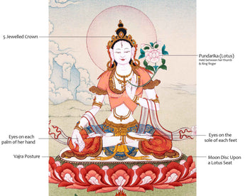 White Tara, an iconic figure in Tibetan Buddhism, is revered as the embodiment of compassion, healing, and longevity. She is often depicted as a serene and radiant goddess with seven eyes, symbolizing her watchful presence and the extent of her compassion. White Tara is believed to offer solace and protection to all sentient beings, guiding them through the challenges of life with her boundless love. Her white complexion signifies purity, and her graceful posture exudes tranquility. Devotees turn to White Tara in times of physical or emotional distress, seeking her blessings for healing and longevity. With her unwavering commitment to alleviating suffering and extending life, White Tara is not only a divine figure but also a profound symbol of hope and compassion in the Buddhist tradition.