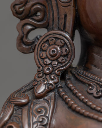 We have exquisitely hand-painted the sculpture of the White Tara Goddess with acrylic colors in a traditional Himalayan style of Nepal. We have sculpted finely in an oxidized copper body and embellished the ornaments with jewels. You can use this statue in different activities like in various Buddhist rituals and your regular meditational activities. We have depicted a deity seated on top of a moon disc lotus seat with a tranquil expression. We assure you that the materials used in this art are of high quality and will last for many years. This art of Himalayan will be a tremendous gift for a practitioner like you.