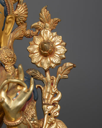 This beautiful White Tara Gold Gilded Oxidized Statue will bring a relaxing presence to any living space or spiritual space. This statue, which stands 48.5 cm tall, was carefully crafted from an oxidized copper body and embellished with paintings in gold and acrylic as well as 24K gold gilding. The delicate details, which enhance the serenity of your meditation or shrine space, perfectly reflect the essence of White Tara with her elegant features and serene smile.