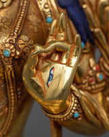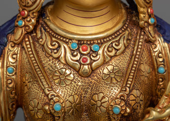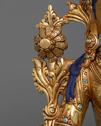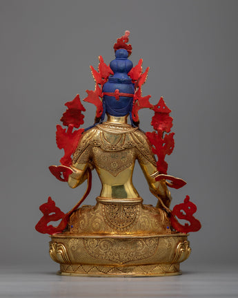 This sculpture is masterfully constructed with a copper body, ensuring durability and traditional elegance. It is lavishly gilded in 24K gold, symbolising the statue's sacred character and the pure, enlightened spirit that White Tara embodies. The meticulous gold and acrylic paintings enhance the statue by spotlighting White Tara's tranquil look and the fine details of her clothing.