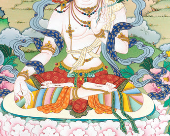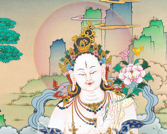 The White Tara Meditation Art Print is a stunning representation of the revered Goddess of Compassion and Longevity. This exquisite piece has been meticulously printed on a high-quality cotton matte canvas using the giclee printing technique, ensuring vibrant colors and intricate details that capture the essence of this divine figure. White Tara's serene and compassionate presence radiates from the canvas, making it a perfect addition to any sacred space or home decor setting. This art print not only embodies the spiritual significance of White Tara but also offers a timeless symbol of compassion and longevity, inviting peace and positive energy into your environment. It serves as a beautiful reminder of the boundless love and blessings associated with the Goddess of Compassion.