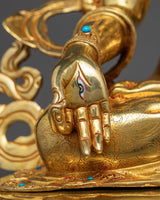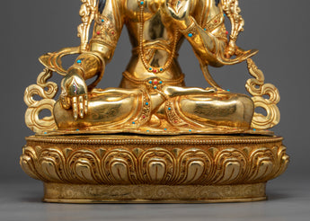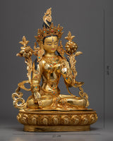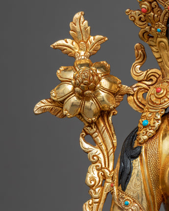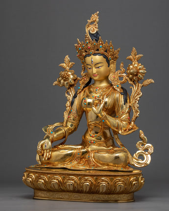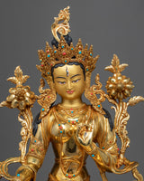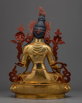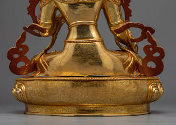 With the skillset and technique inherited from centuries, we have beautifully crafted the White Tara Meditation Statue in our studio. In the statue, we have depicted the White Tara seated upon a moon disc lotus with a gentle expression, her hands are holding an utpala or lotus stem, which blooms beside her head. The molding of the statue was completed with copper. It took us months and months of hard work to hand-crave intricate design patterns on the crown and the robe. We have embellished the body ornaments, crown and the robe with precious gemstones. The figurine with gilded using pure 24K gold.