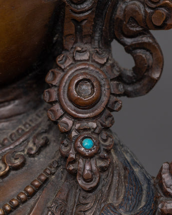This White Tara statue, revered as the Mother of All Buddhas, represents knowledge, compassion, and spiritual purity. It is handcrafted, measuring 12.4"/31.5cm (Height) by 8.5"/21.5cm (Base), weighing 3.01 kg. This timeless item, crafted from oxidized copper, that emphasizes her sacred significance in Tibetan Buddhism. This statue is ideal for embellishing your meditation area, Buddhist shrine, or as a treasured spiritual gift. It brings serenity, healing, and heavenly benefits into any situation.