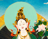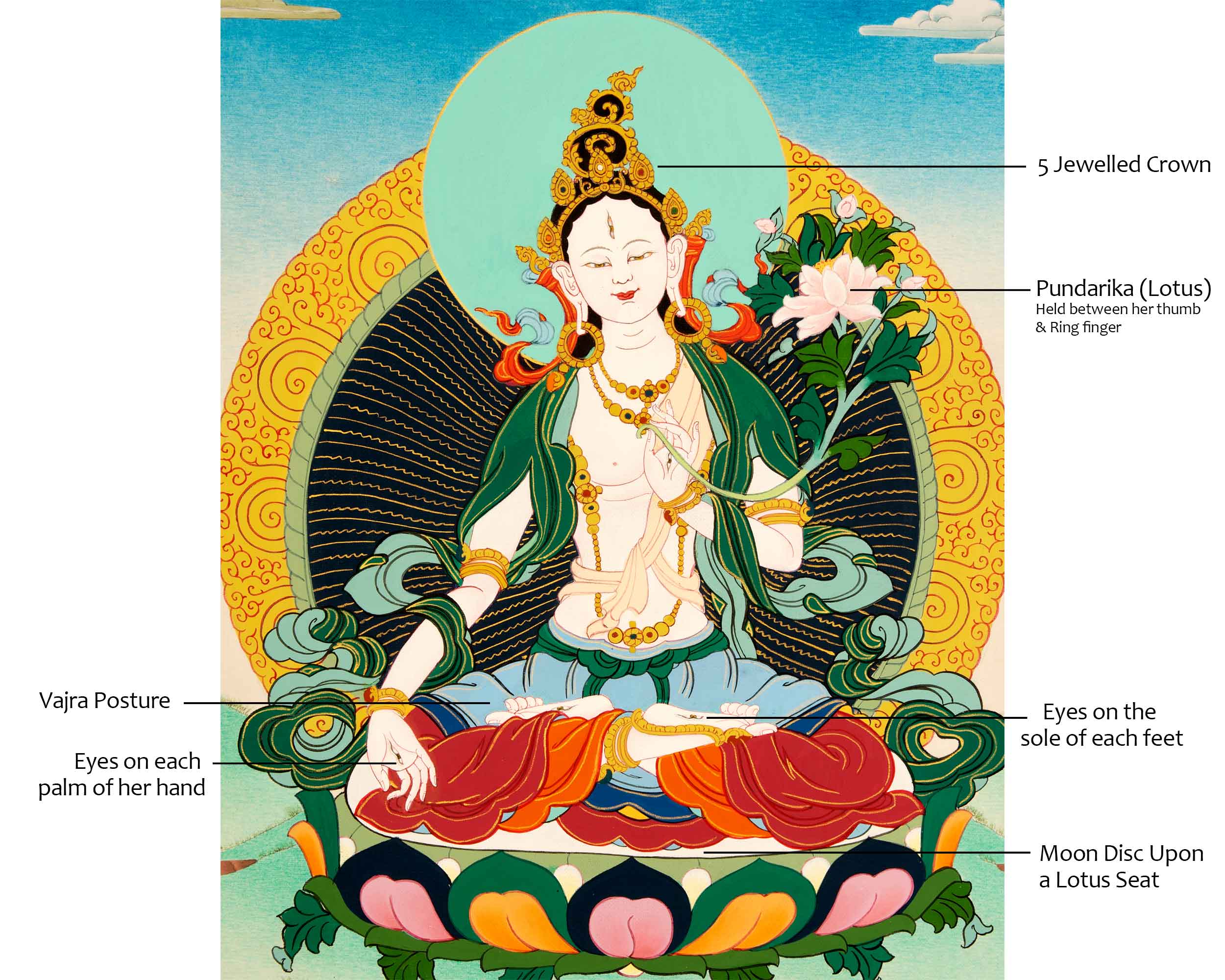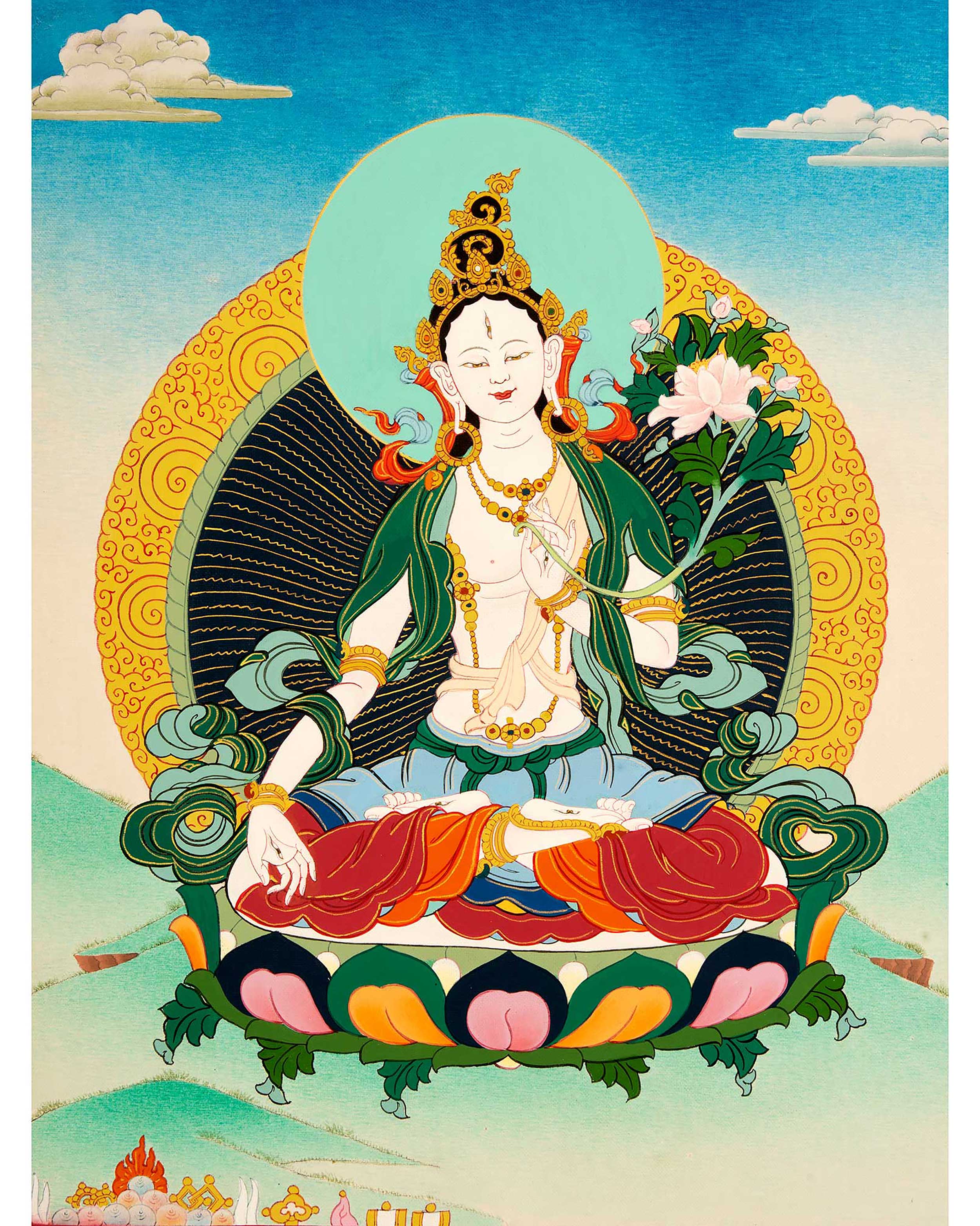 Note: White Tara Thangka is an original painting from Enlightenment Studio, located at Boudha Stupa.