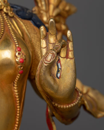 The statue, immaculately embellished with 24k gold gilding, exudes a regal atmosphere, symbolizing White Tara's protective and beneficent attitude. The meticulously painted acrylic details contrast beautifully with the solid copper body, demonstrating a balanced blend of artistry and devotion. This is more than a statue; it's a spiritual companion, perfect for meditation places, personal altars, or as a centerpiece for your living space, emanating a sense of peace and devotion.