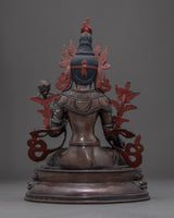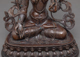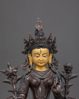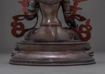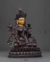 We have traditionally Hand-carved this White Tara Buddhist sculpture in a pure copper body and gilded the face with genuine 24k gold and sculpted it on oxidized copper. The artist of Kathmandu valley has exquisitely sculpted in traditional Himalayan art. The artisan of the Nepali statues has passed from generation to generation that reflecting Buddhism. Mother Tara is depicted sitting on a top moon disc lotus seat with a serene expression. This small indoor statue of the Female Buddha will enhance your meditational interest and gives positive energy to a practitioner like you.