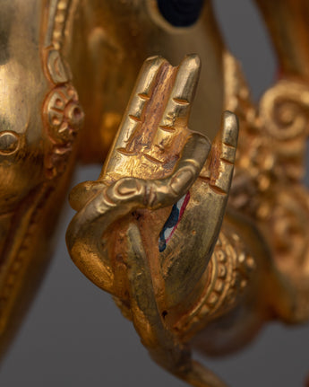 This stunning White Tara statue is a magnificent representation of the revered female bodhisattva in Tibetan Buddhism. Crafted with the utmost care and precision, this copper statue boasts intricate details and a rich, golden finish thanks to the gold gild that brings the beauty of White Tara to life. The statue depicts White Tara serenely seated in a lotus posture on a moon disc lotus seat. She is depicted with five eyes in total, two on her face, one on her forehead, and two on each of her palms, representing her ability to see beyond the physical world and into the realm of enlightenment. She performs the 'Prithvi mudra,' with her right hand representing stability and healing, while her left hand performs the 'Varada mudra,' a gesture of charity while holding a lotus flower.