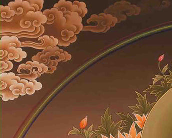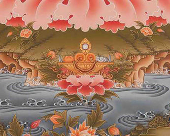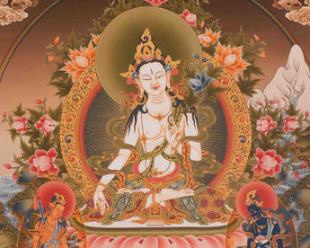 In this beautiful Thangka painting we can see the two Boddhisattvas on the bottom part of the painting and the exquisite scenery in the background adds up to White Tara’s beauty. In the middle part of bottom register lies the offering substance along with auspicious symbols.