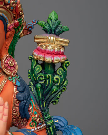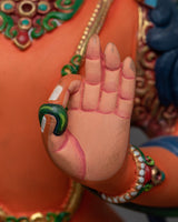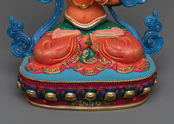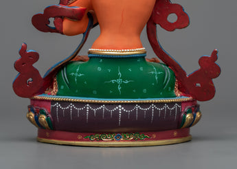 This statue is expertly constructed with a copper body and 24K gold plating. The entire body is painted a bright orange, echoing traditional iconography that represents Manjushri's wisdom and learning. The gold and acrylic paintings contrast with the orange hue, emphasizing the fine details of Manjushri's features, such as his sword of wisdom and book of ultimate knowledge.