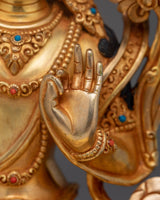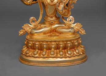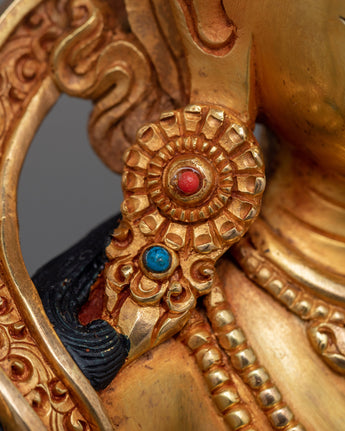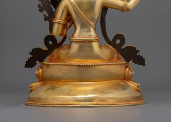 With a height of 9.4 inches (24 cm) and a base of 6.9 inches (17.5 cm), this statue of the Wisdom Buddha, Manjushri, represents the pinnacle of enlightenment and knowledge. This piece, which weighs 1.78 kg, has a copper body 24K gold gilding and rich acrylic paintings.